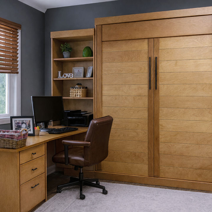 Elevate your space with a Murphy bed that blends handcrafted detail with clean, architectural style. This design features hardwood maple veneer panels, carefully cut into individual planks to create a rich, dimensional surface that highlights the natural beauty and grain of the wood.
